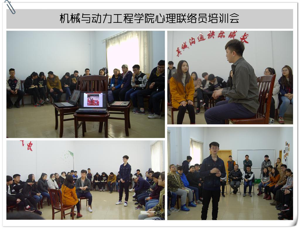 3月4日,为了提高心理辅导站各辅导员及联络员的理论水平和工作能力,同时为了推动新学期工作的开展,机械与动力工程学院于校心理辅导站召开第四次心理联络员培训暨工作布置大会。参加此次会议的有负责心理专项工作的王瑾老师,“植心圃”心理辅导站所有成员。届时,经济与管理学院的同学也前去学习。